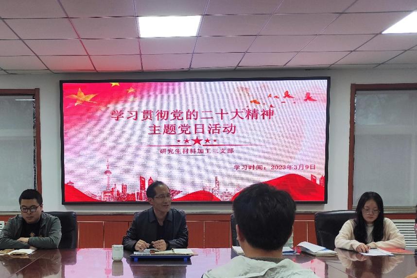 会议室开展了“学习贯彻党的二十大精神”理论学习会,刘斌副院长出席本次活动,参会人员为研究生材料加工三支部全体党员。本次学习会目的在于深入学生党员群体,领会党的二十大精神内涵,加强学生党员的党性修养。