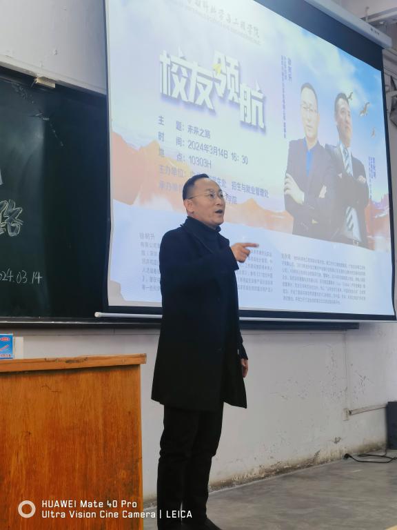 刘秋明董事长以《未来之路》为主题展开演讲。秋明学长分享了自己在求学、工作、创业等不同人生阶段中的丰富经历,他希望同学们在大学期间要学好科学文化知识,积极参加科技赛事,不放过任何可以提升自己能力的机会,为自己的将来打好基础。同时,他勉励同学们不管将来如何选择,都要有“争第一”的想法,并要提升自己的执行力,要将想法付诸于行动,比别人多努力一点,就比别人离成功更近一点。最后,他告诉同学们要“敢于吃苦,善于学习,不怕失败”,现在短暂的迷茫是因为对未来的不确定,但只要有坚韧强大的内心,再加上扎实的知识和技能,那就一定能走好属于自己的未来之路。