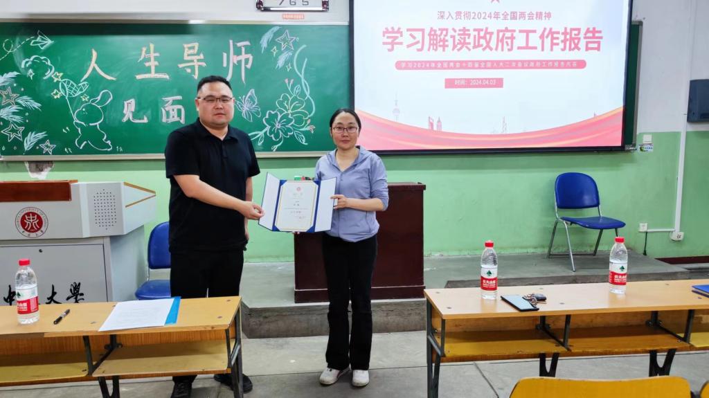 见面会伊始,王超副院长上台致辞,向同学们讲解了学校为本科生配置人生导师的意义,切实发挥全员育人功效,提高育人质量,促进学生全面发展,推进我校三全育人体系建设;并为同学们隆重介绍了人生导师-科研院副院长崔敏老师。致辞完毕,由王超副院长为崔敏老师颁发了人生导师聘书。