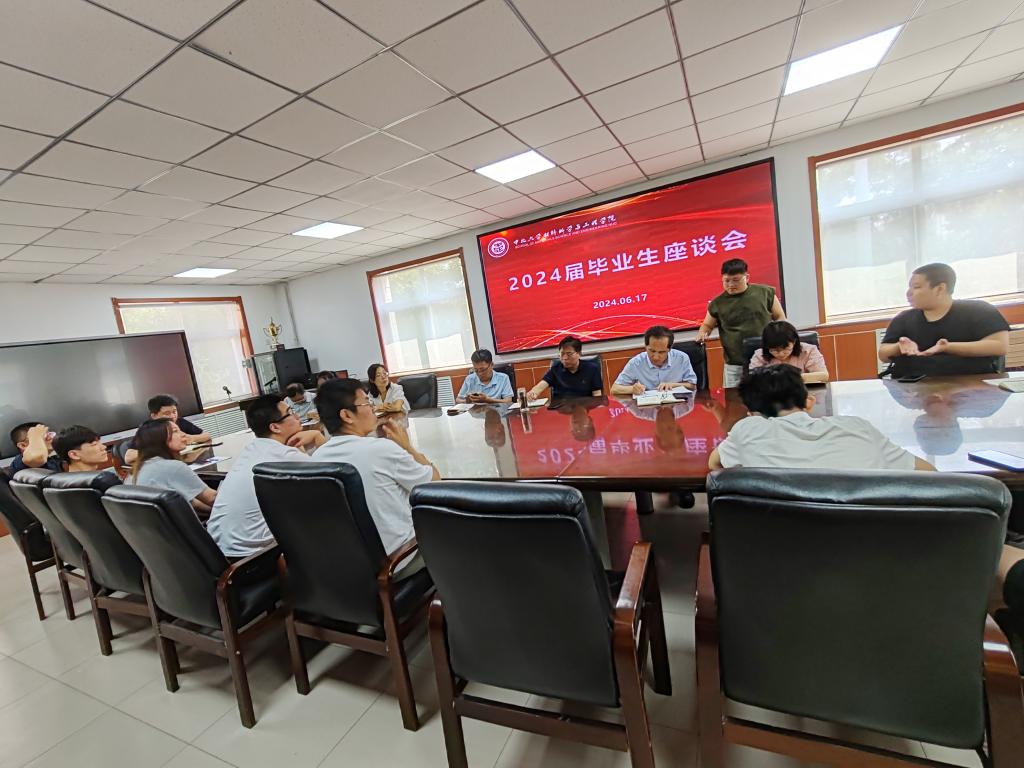 会议室召开毕业生座谈会。院党委书记廖海洪、副院长刘斌、团委书记郝诗韵及各个专业老师们与各专业学生代表进行了亲切的交谈。团委书记郝诗韵老师主持本场座谈会。