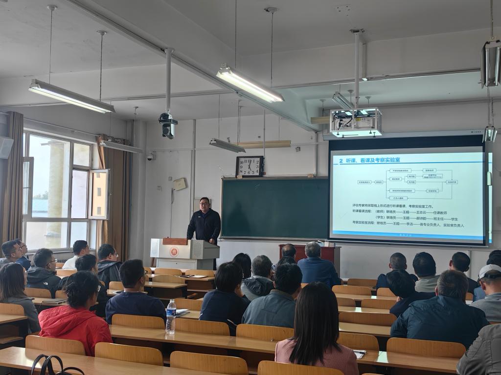 长王超首先对本次本科教育教学审核评估的总体情况进行了介绍,接着对听课看课、资料调阅、参观实验室、专题调研及访谈座谈等评估内容及具体流程做了详细说明,每项任务都落实到人,责任到人。强调各位教师要加强大局意识,严格按照评估要求,准备好相关材料,确保材料的有效度和完整度,以主人翁的姿态积极做好各项准备工作。
