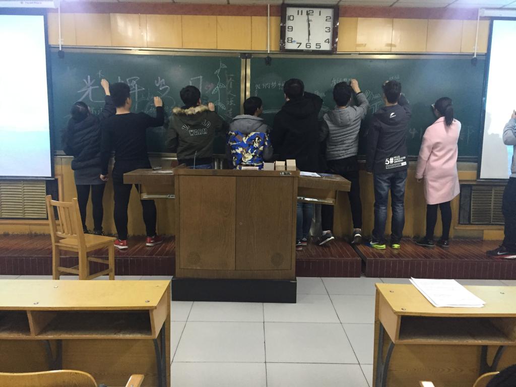 本次团课共分为三个环节:观看励志微电影《光辉岁月》,主题班会,书写我梦想、畅言我未来。微电影以beyond乐队为背景,讲述了他们在自己梦想道路上奋斗历程。在观影结束后,同学们上台发表了各自的感想,表达了自己对梦想的看法。随后团支书王梅月利用PPT向大家说明了在大学中为梦想去拼搏的重要性:每个人都应有梦想,并且要在自己的梦想道路上脚踏实地、坚持不懈的一步一步走下去。在最后的“书写我梦想、畅言我青春”环节,同学们上台将自己的梦想写在了黑板上,并向大家介绍了自己定下这个梦想的原因以及要如何去做来实现这个梦想。同学们积极发言,畅言青春,团课便在一片欢快的气氛中结束了。