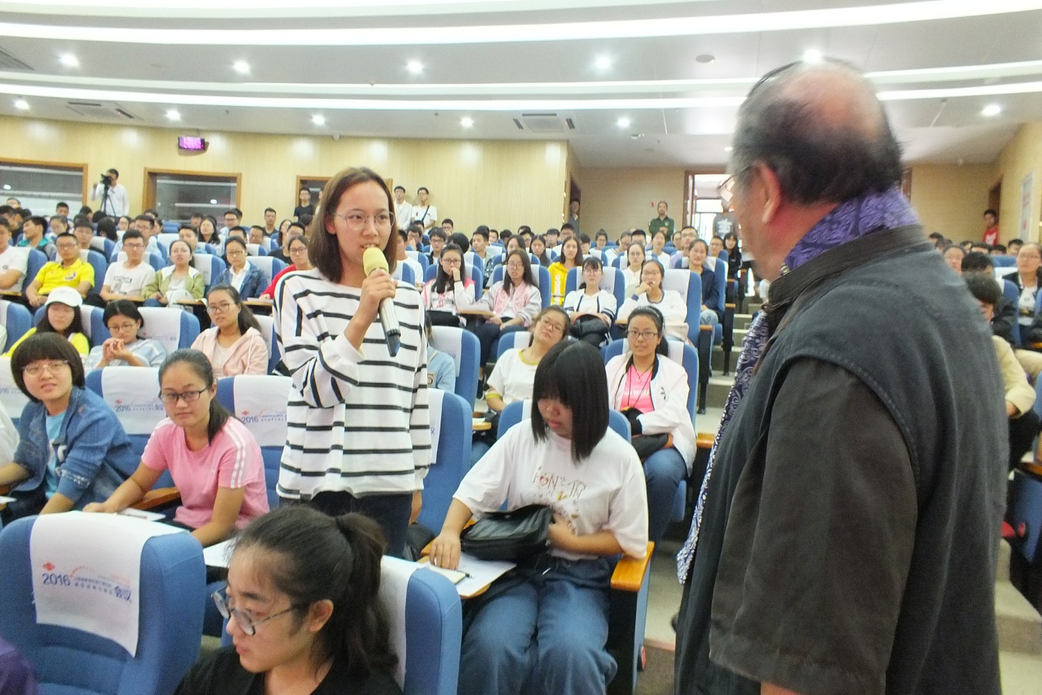 演讲伊始,彭老先生向我校捐赠了100本图书。他说:“读书会给人无形的力量”,鼓励同学们刻苦读书,努力学习,争取成为国家栋梁之材。随后,彭老用“活着的意义”引发全场思考,让同学们积极表达自己的想法。他说“生命的价值不在于活的长短,而在于有限的生命之中,为国家、为民族、为家庭、为他人到底干了多少好事!”,当同学们背诵这句话,现场热情高涨!彭老还强调“尊师重道”是中华民族数千年来的优秀传统美德,大学仍旧是老师传授知识的平台,唯有尊重老师,尊重知识,在未来才能真正成为一身凛然正气的引领者。彭老的演讲有声有色,慷慨激昂,现场时而掌声阵阵,时而欢笑连连,时而让人涓然泪下。
