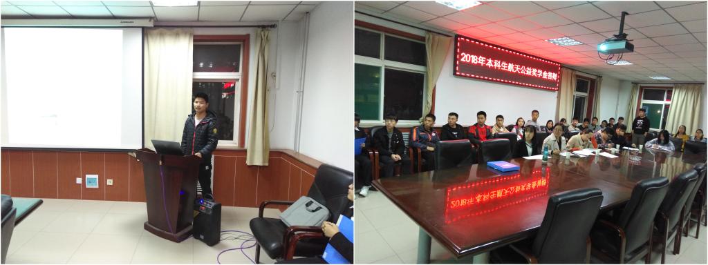 于院办会议室举行了2018年度本科生航天公益奖学金答辩会,本次答辩由院党委副书记郭云霞老师、学生科科长殷炳叶老师、学生科宋春丽老师以及两名研究生代表担任评委,答辩选手有15030542班闫磊、15030442班另友权、15030442班邱鸿林,部分18级学生到场聆听。